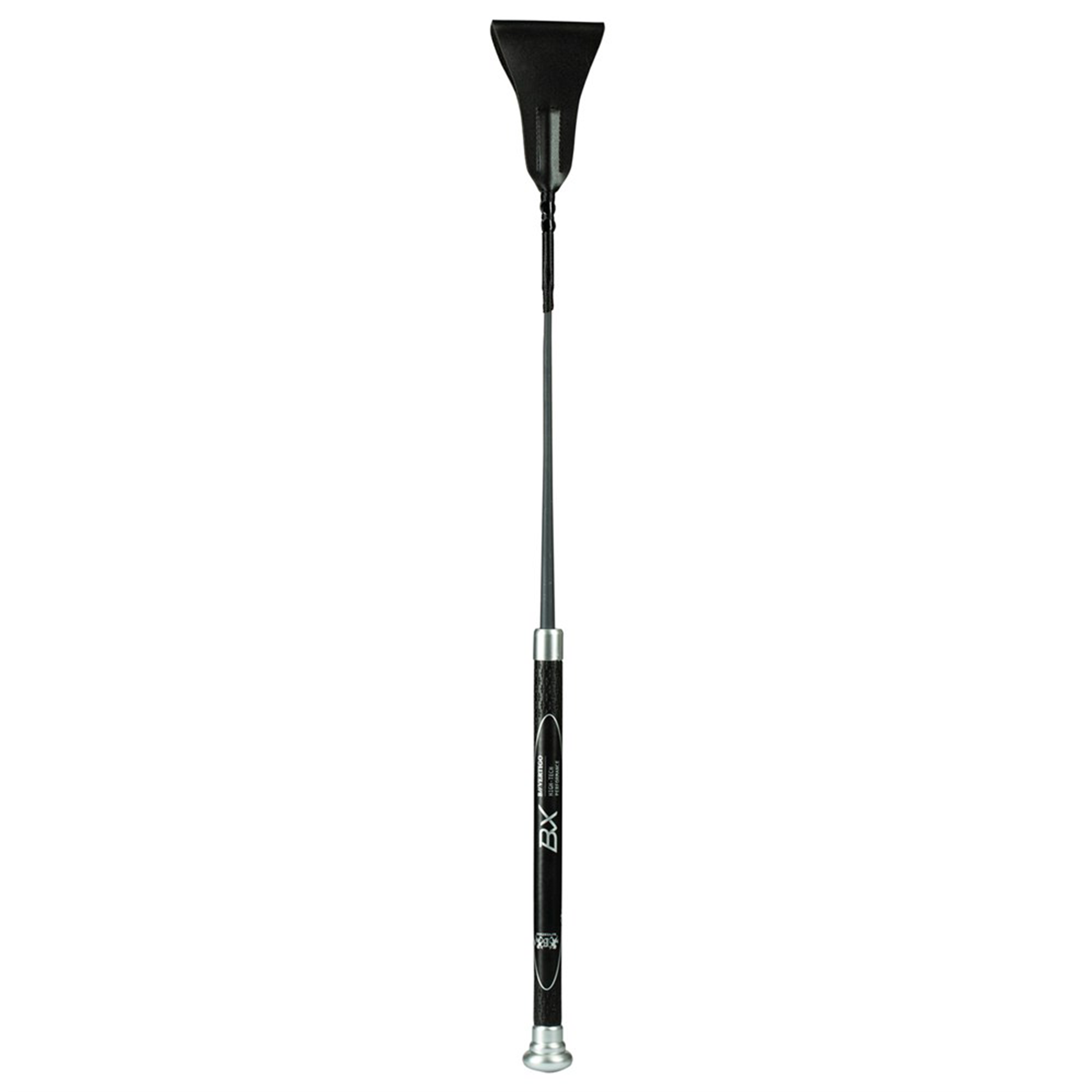 This bat fits perfectly in the rider's hand with a rubberized grip. This rich grey and black strong bat is perfect for schooling or show.