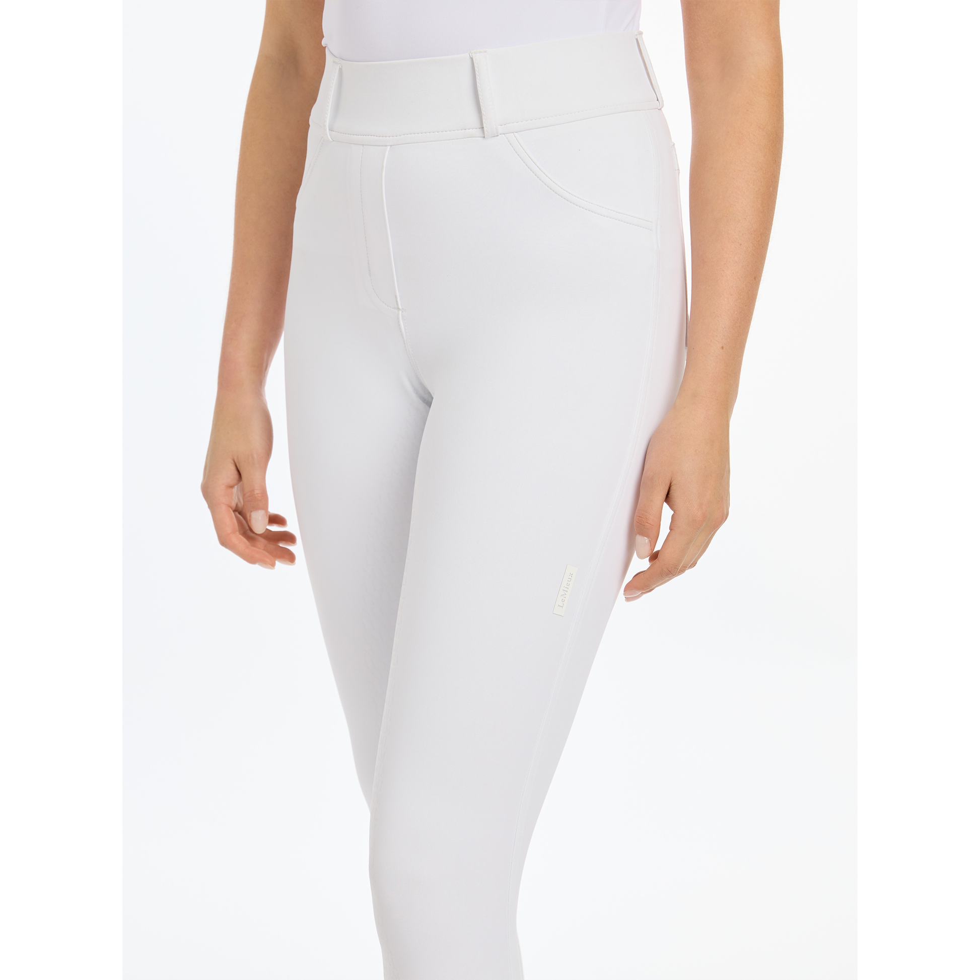Belt loops on the waistband, side pockets and a faux fly front create the authentic 'breech' look. Choose your favourite colour and coordinate your entire horse riding wardrobe.