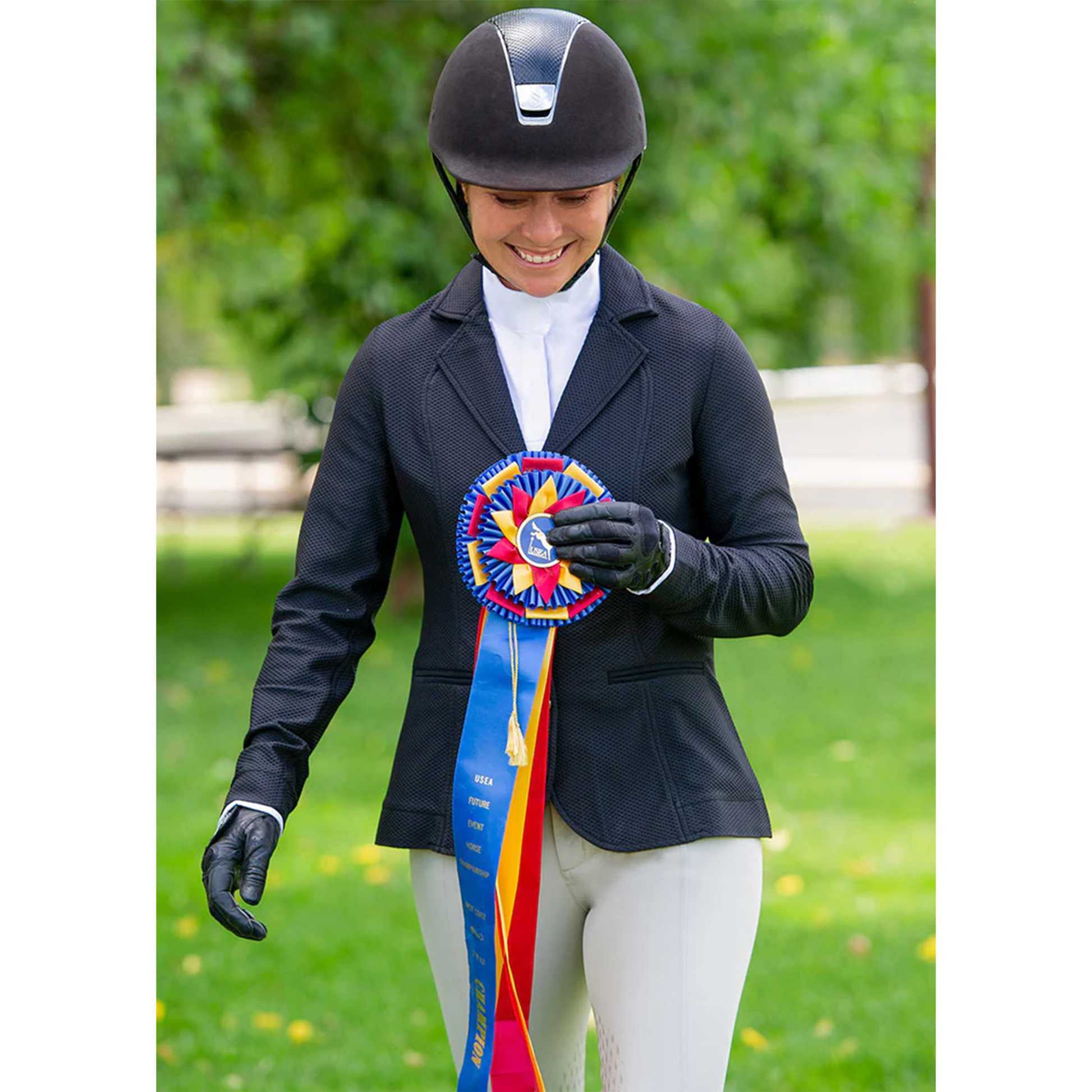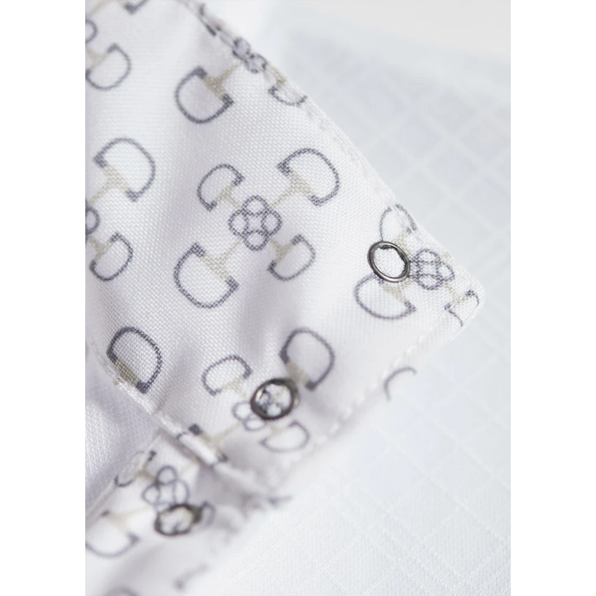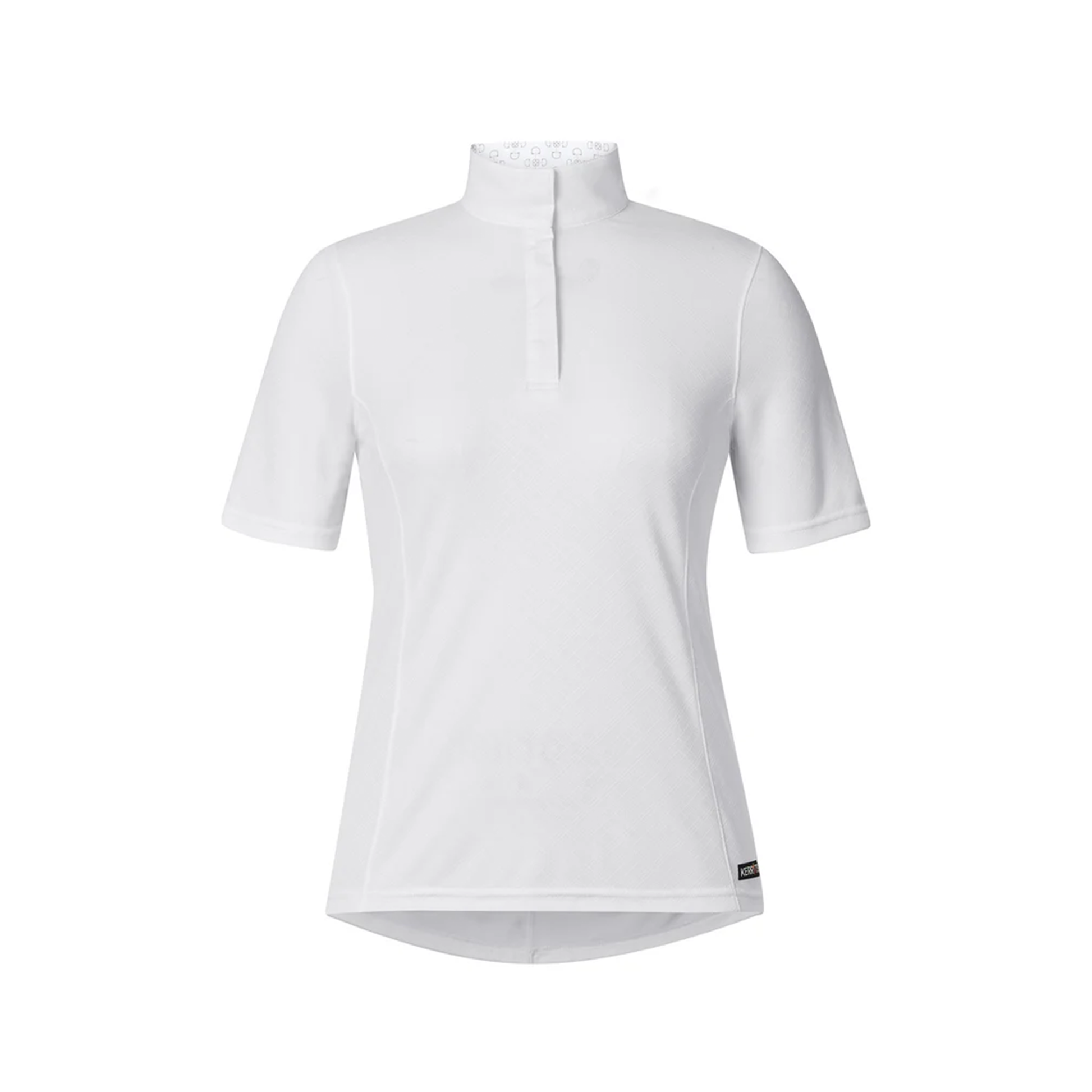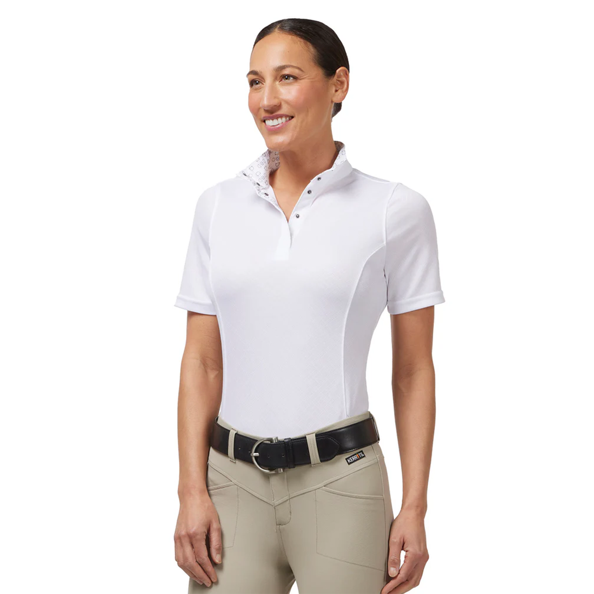 A equestrian short-sleeved show shirt, crafted from textured, UPF+30 Ice Fil Diamond Tech fabric that cools, covers, and stretches. Mesh panels at center back vents and cools for comfier competitions. Feminine fit flatters while Kerrits Lucky Diamond pattern inside the snap collar adds a hint of color to this summer riding essential.