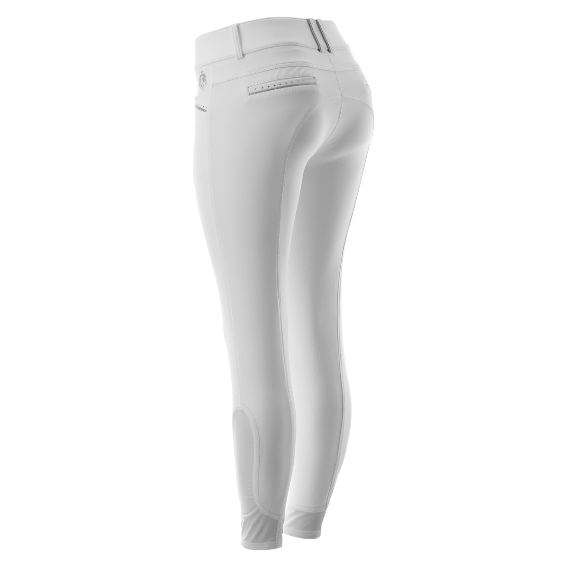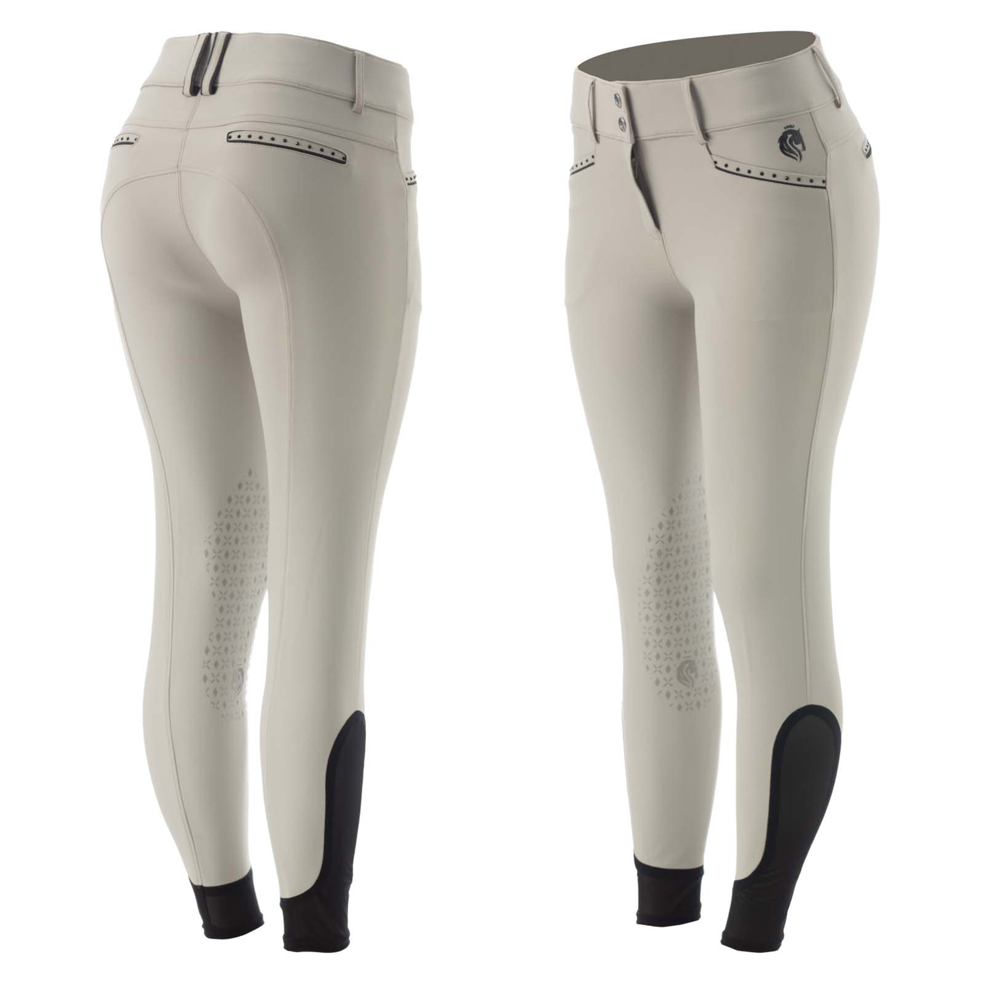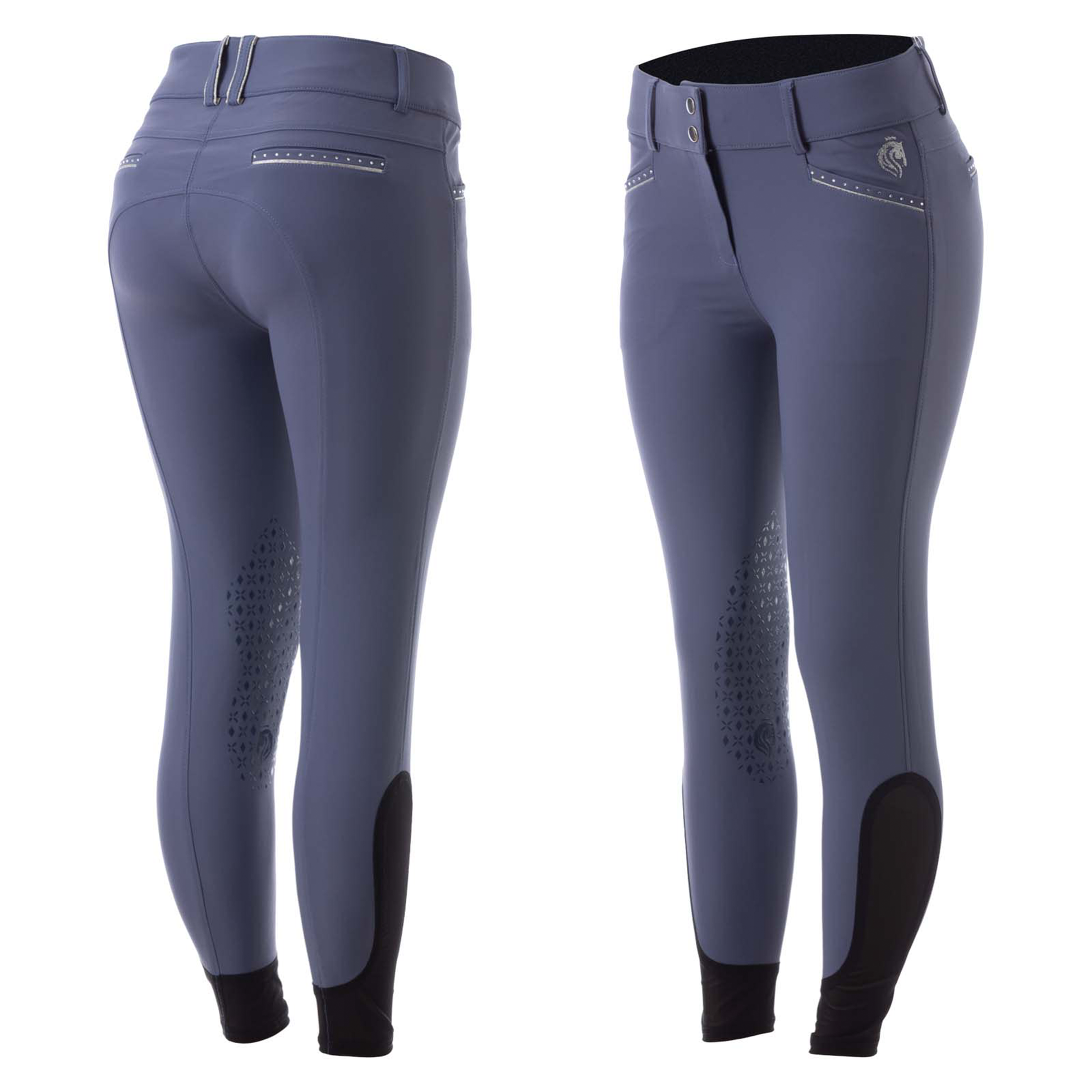 The Equinavia Victoria Womens Silicone Knee Patch Breeches are made of high quality technical fabric that is breathable, moisture-wicking, and quick-drying. Spandex provides stretch for maximum freedom and support while keeping its shape. Silicone grip knee patches offer ultimate security in the saddle, while mesh at the lower legs keeps you cool and streamlined underneath the boots. Finished with a silver lurex logo on the left pocket as well as silver piping and crystals on the front pocket and the back fake pocket will make you stand out in the ring.