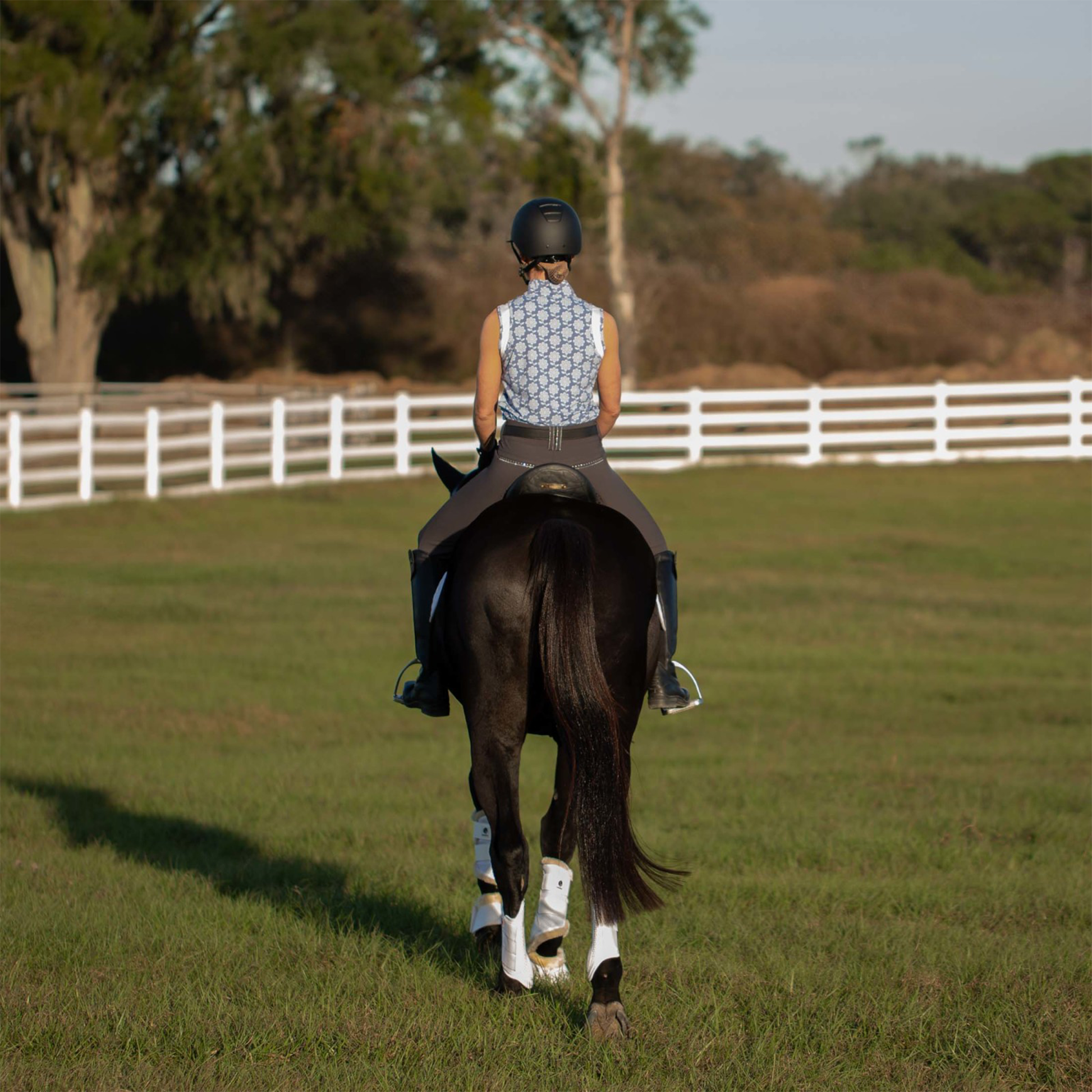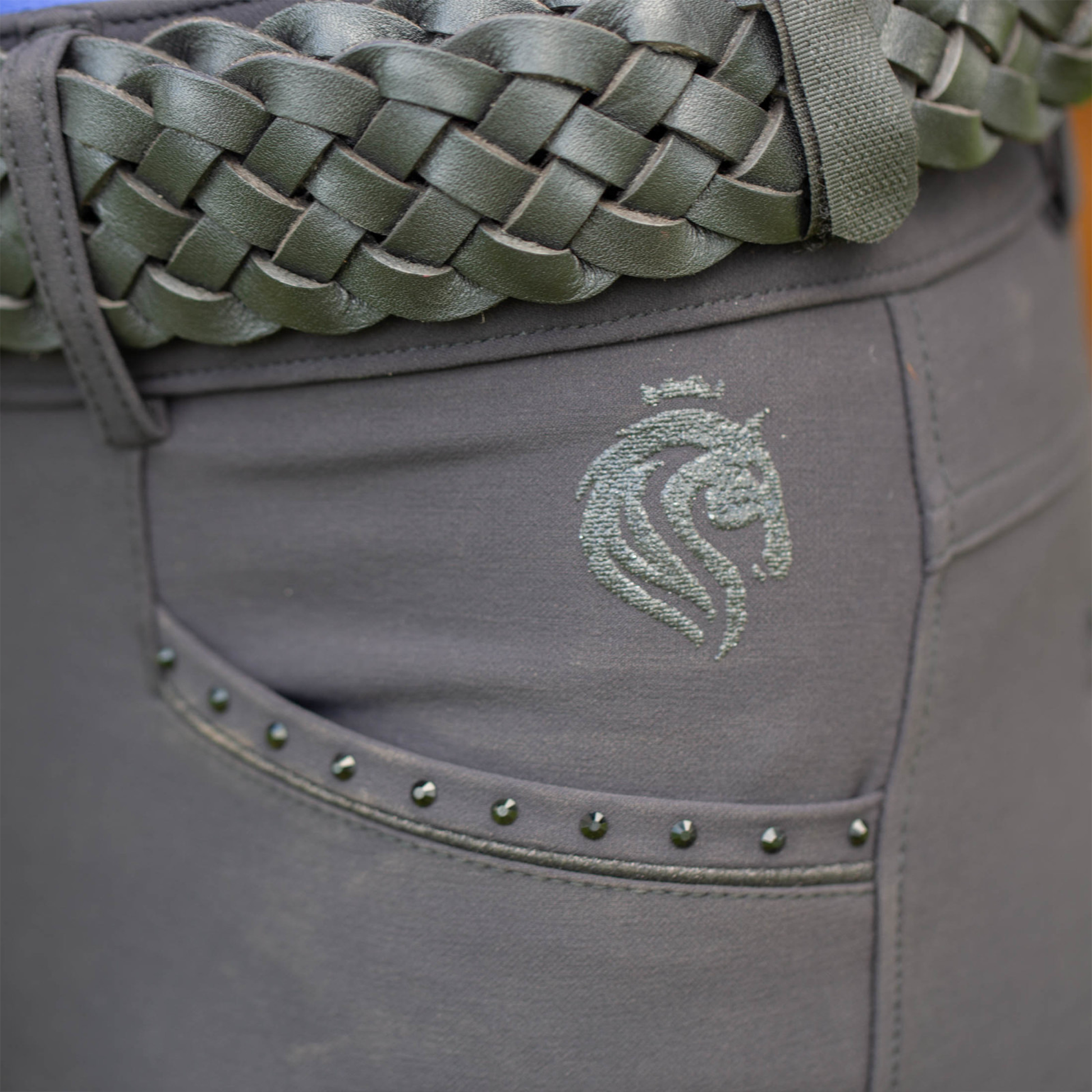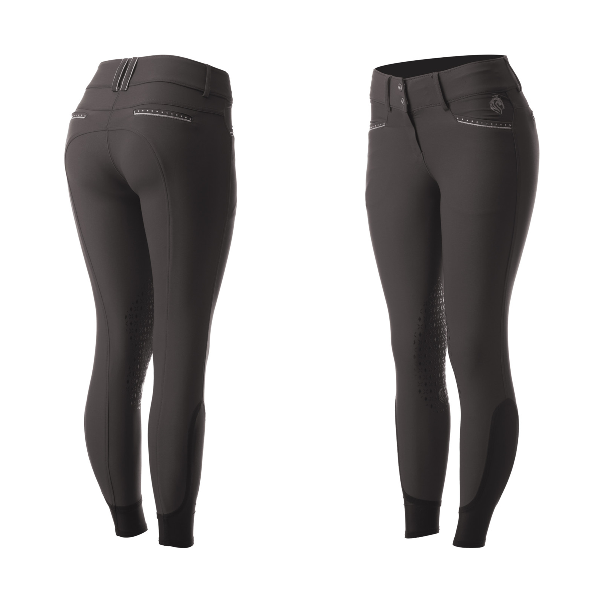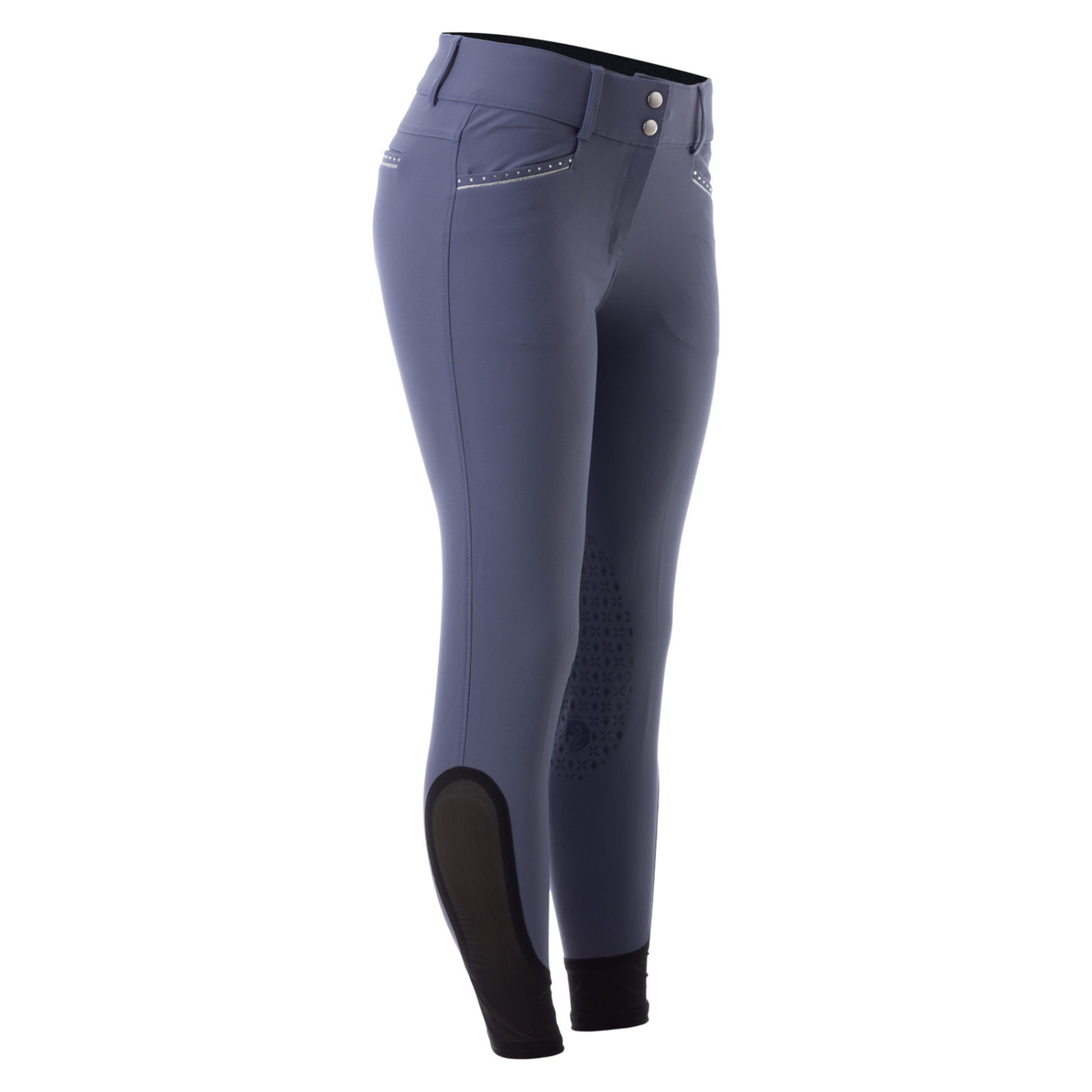The Equinavia Victoria Womens Silicone Knee Patch Breeches are made of high quality technical fabric that is breathable, moisture-wicking, and quick-drying. Spandex provides stretch for maximum freedom and support while keeping its shape. Silicone grip knee patches offer ultimate security in the saddle, while mesh at the lower legs keeps you cool and streamlined underneath the boots. Finished with a silver lurex logo on the left pocket as well as silver piping and crystals on the front pocket and the back fake pocket will make you stand out in the ring.