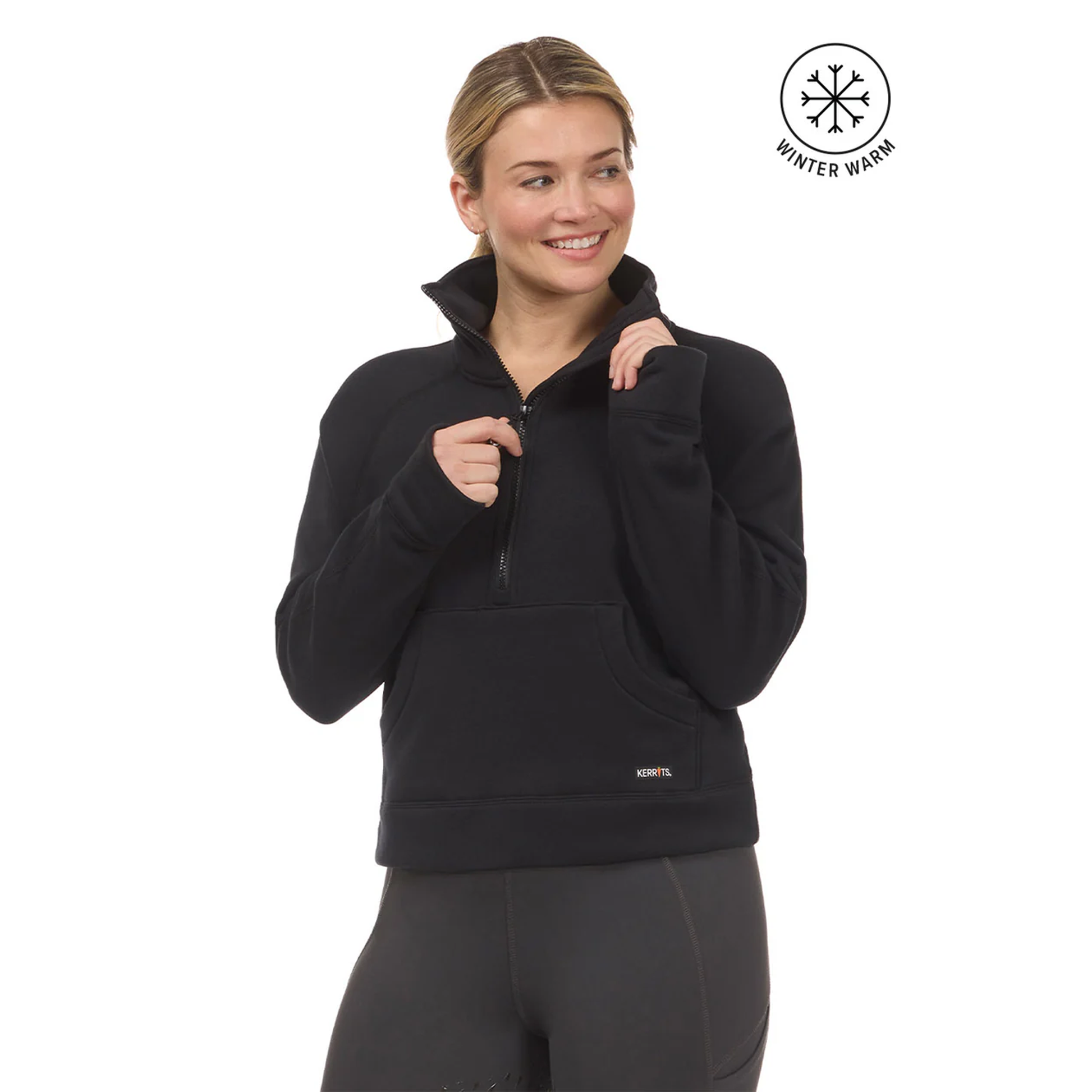 This cropped sweatshirt offers equestrians a stylish, functional layer for cooler days. Crafted from mid-weight stretch fabric with plush fleece inside, it delivers excellent warmth and comfort. Featuring Kerrits’ embossed Etched Equine design on the back, it hits at the high hip for a contemporary fit. Details include a tall collar, relaxed raglan sleeves, integrated thumbholes, and a longer front zip extending to the kangaroo pocket.