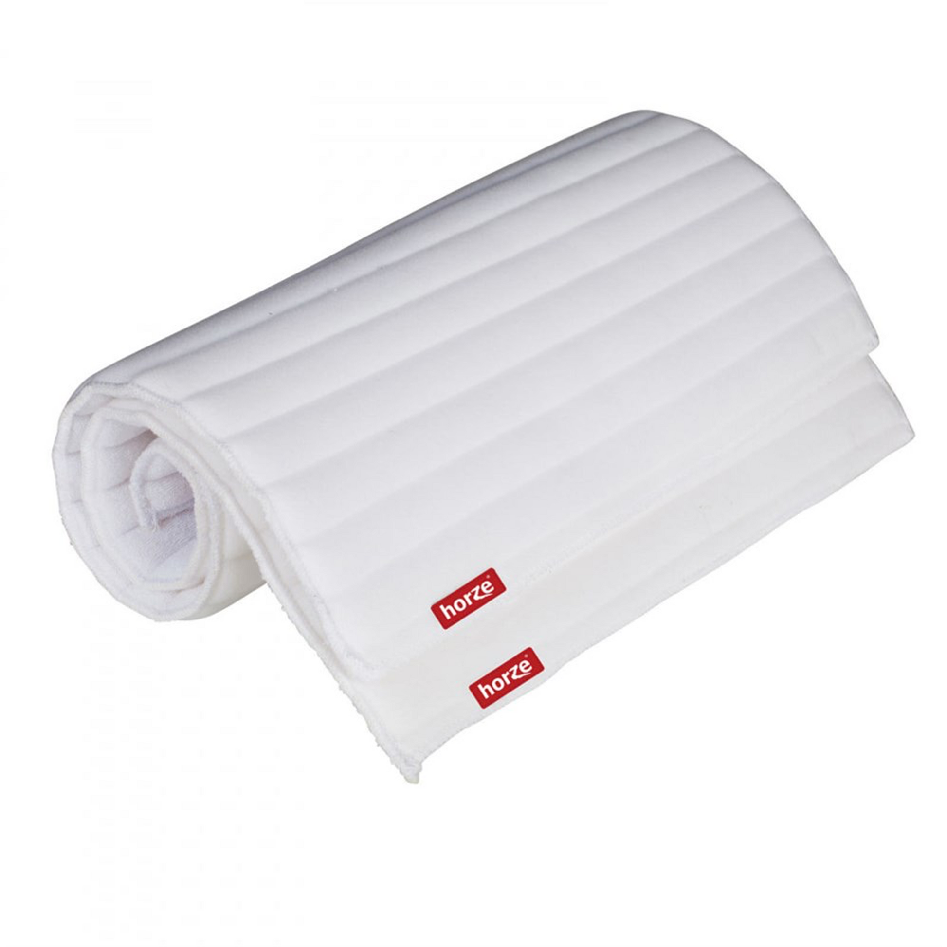 The quilted white fabric will wash and dry between use and maintain it's shape and form. Choose a pair of front and back for a complete set. Will not bunch or wrinkle under any Horze bandages.