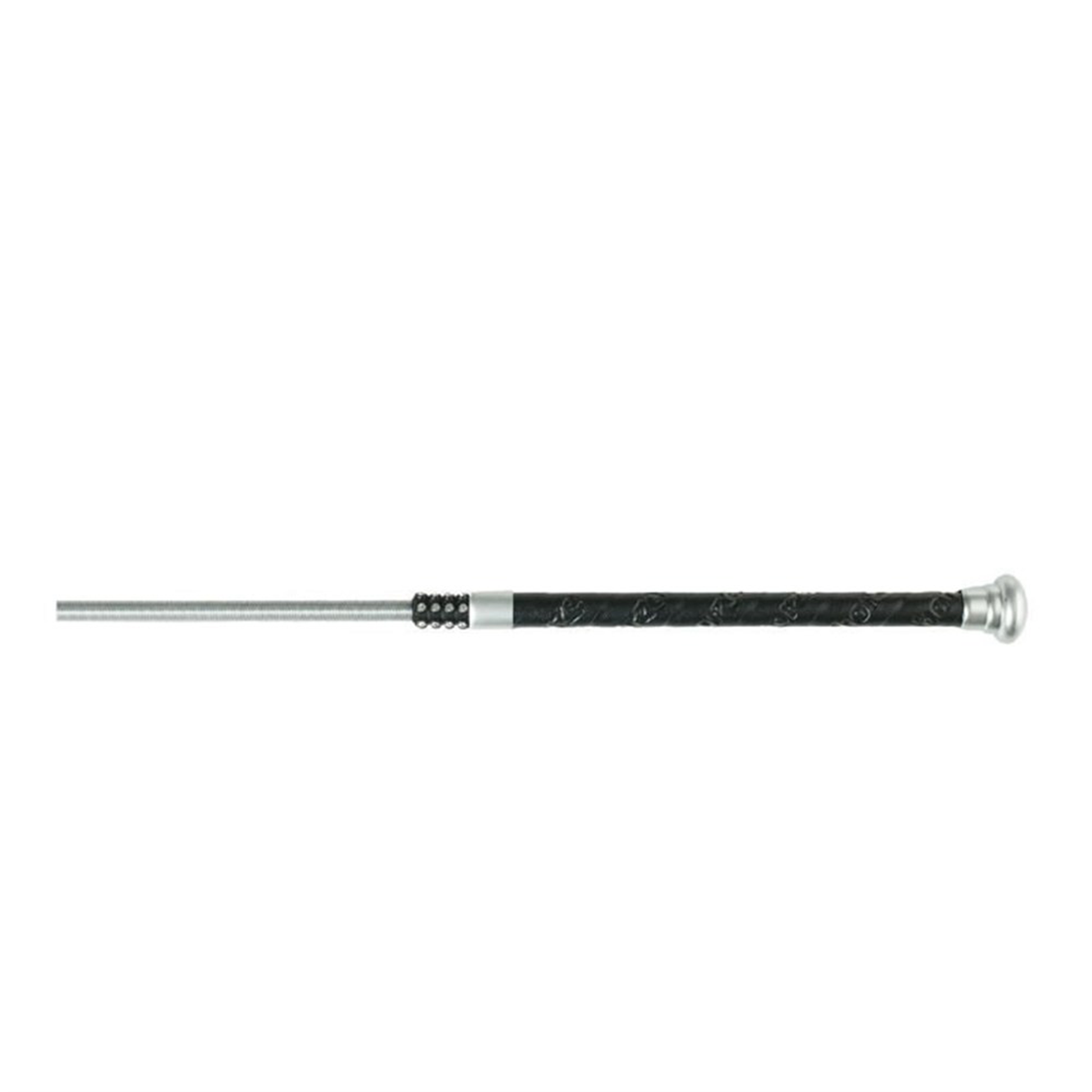 This dressage whip features a four line ring of crystals around the bottom of the handle for a touch of flair. This whip features a traditional metallic mushroom-style cap with an embossed leather handle for added grip. The wrapped shaft is available in a range of colors to match your style.