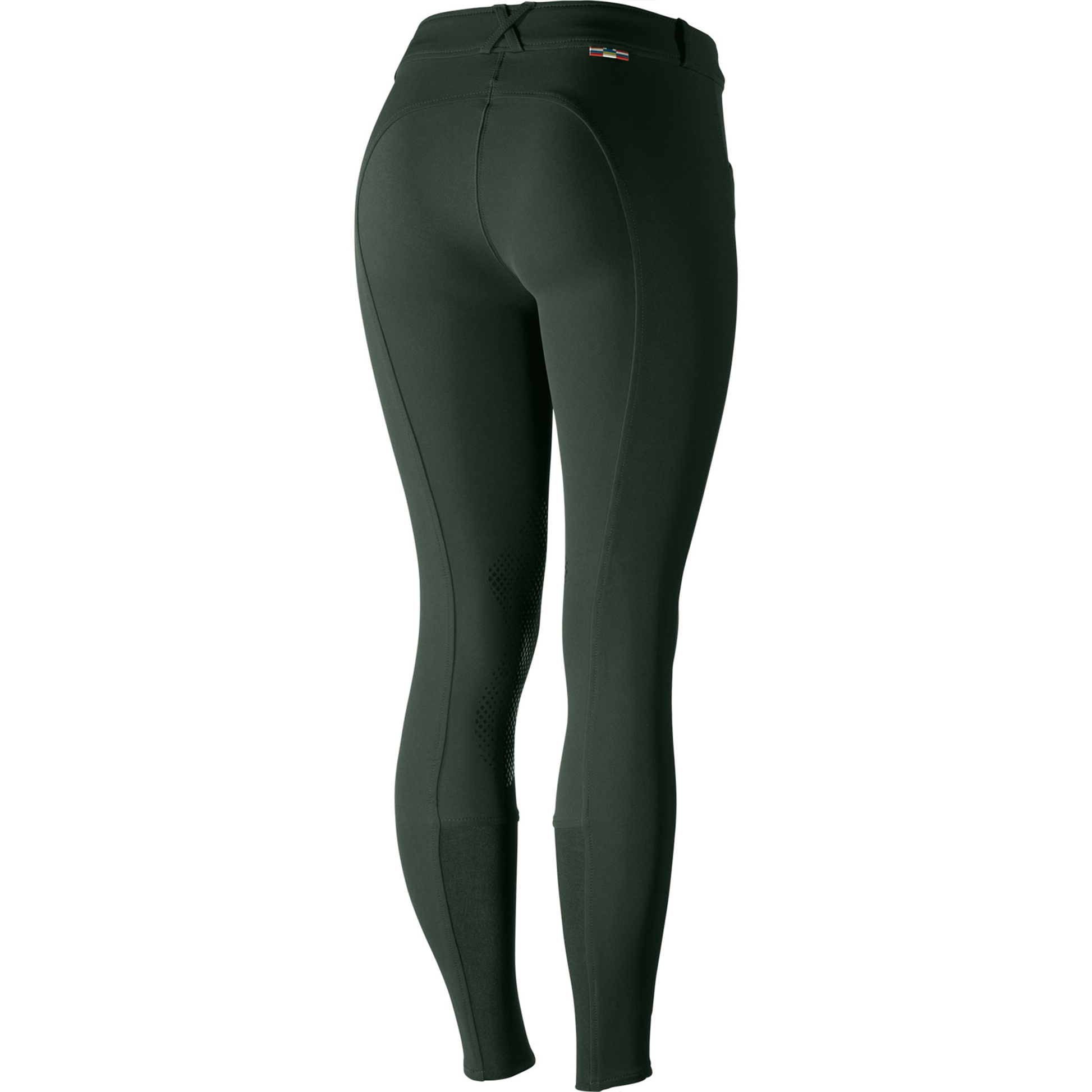 The Horze Women's Grand Prix Knee Patch Breeches with Silicone Patches are Horze's most popular, classic knee patch breeches that have been improved to offer even more benefits to riders of all disciplines and abilities. Approved by top professional athletes, these breeches are both traditional and formal. A contrasting knee patch silicone grip gives practical purpose to these sharp looking simple breeches. Slant front pockets, a wide waistband, and a smooth back are nice touches. You will look crisp and clean all day in this classic cut. The timeless Women's Grand Prix Knee Patch Breeches, by Horze, now have a new silicone surprise at the knee. In addition, the water- and dirt- repellent fabric includes UV protection (UPF 50+).