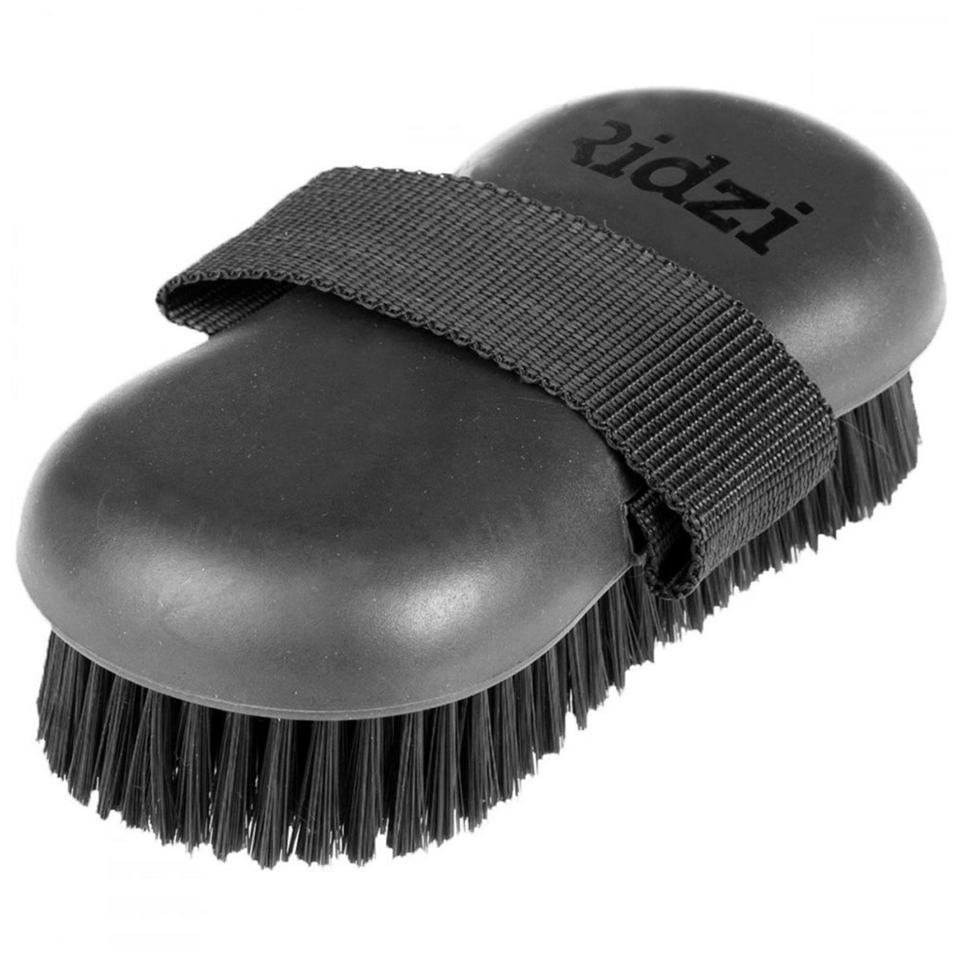Short bristles work hard to get rid of dust and dirt while the soft rubber contoured grip fights hand fatigue for an overall great grooming experience. Durable and long lasting with a reinforced hand loop to ensure a solid grip. Use this after the rubber curry comb to smooth a horses coat. Synthetic bristles.