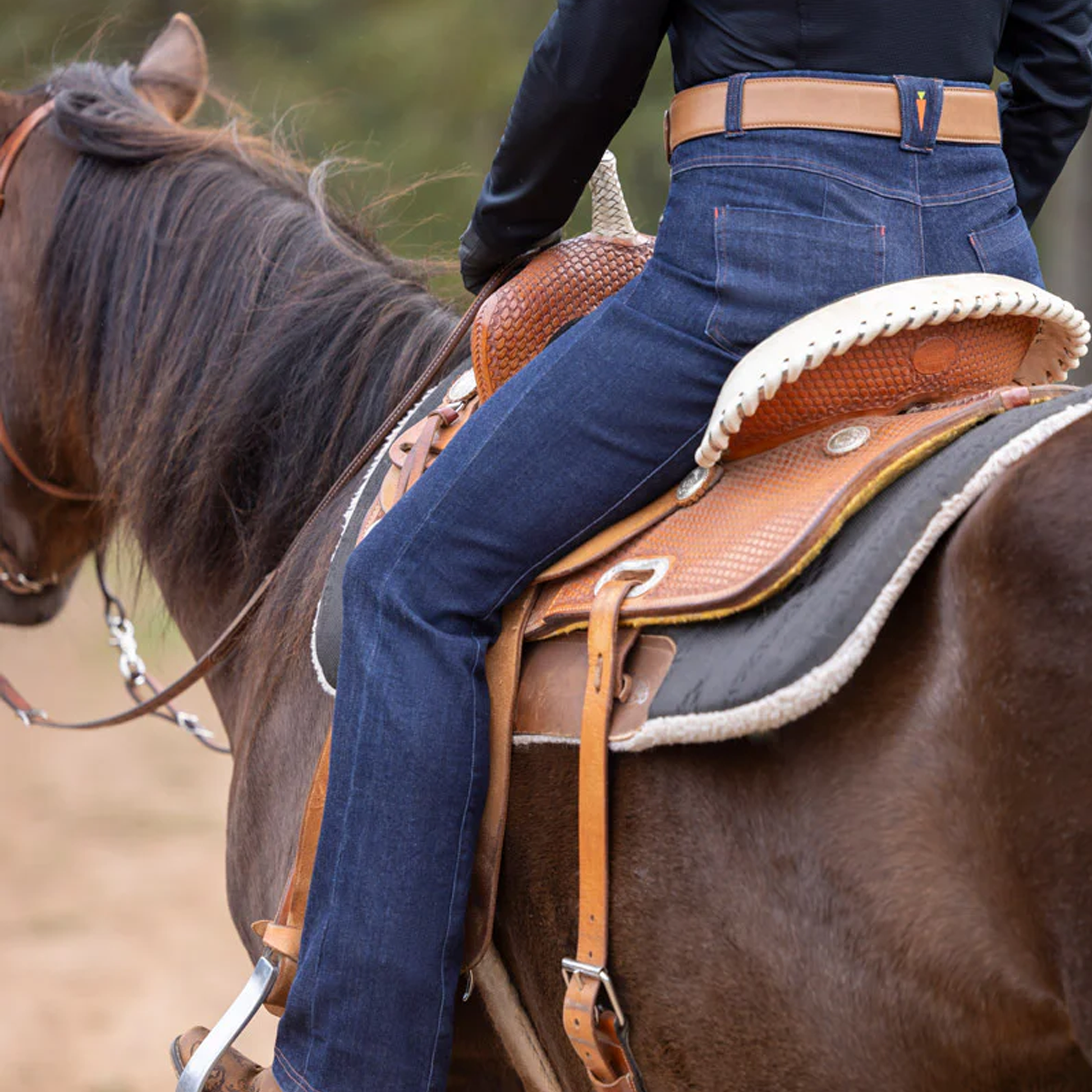 Technically enhanced riding jeans designed in a flattering bootcut style. Cutting-edge technology and award-winning design boost in-saddle performance and durability. The stretch denim fabric is engineered with excellent stretch and stability to retain shape, while DriRelease pulls sweat from the skin to help keep riders cool. Classic jean detailing with five pockets, contrast stitching and a front zip fly. The extended patch delivers leather-like grip all the way to the ankle.