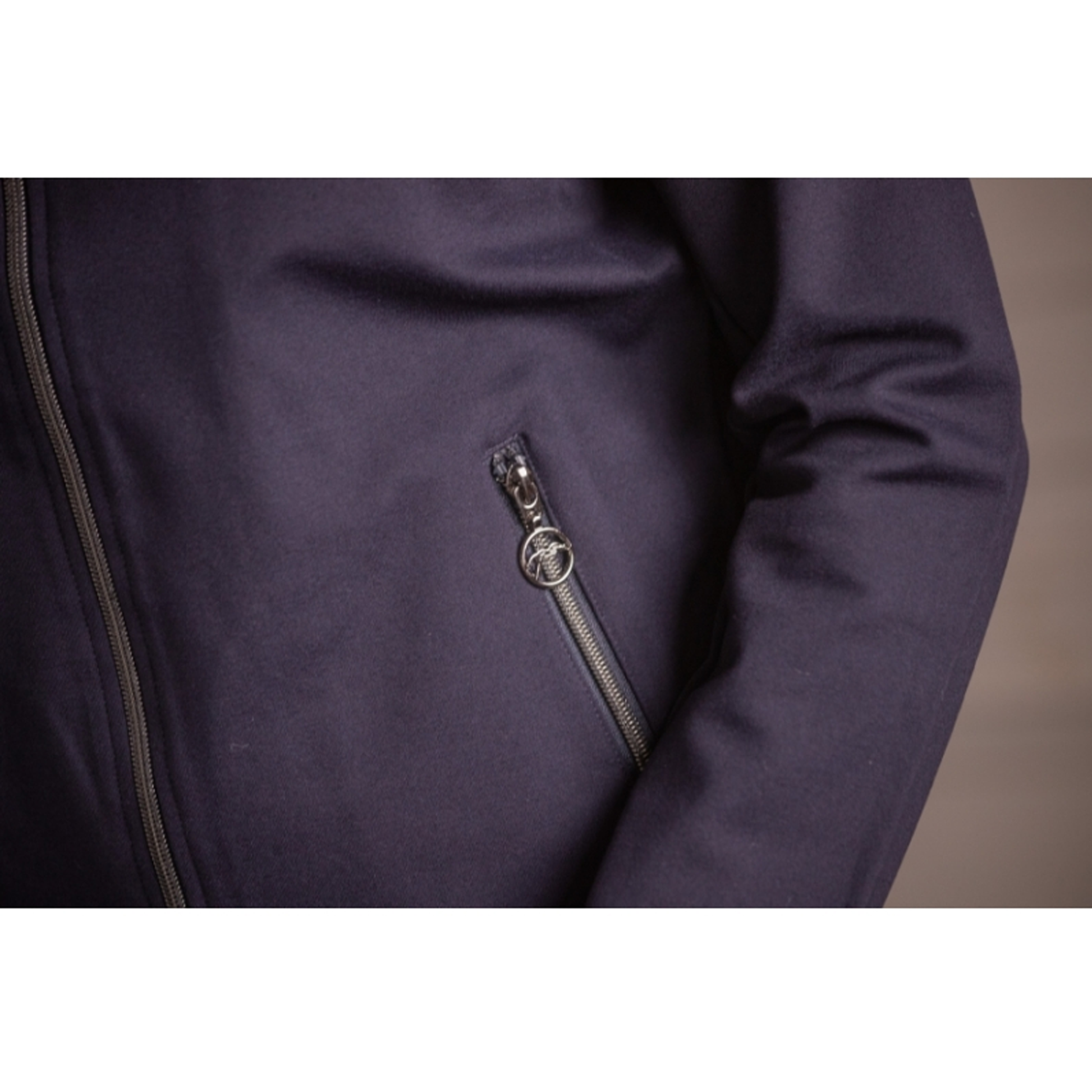 Lightweight jacket with a "sporty chic" look, zippered at the front. It features a stand-up collar and two zippered pockets on each side. The bottom is slightly cinched with a small elastic band. The shoulders are gathered and accented with a glossy and shiny trim. The Pénélope logo appears in rhinestones on the chest.