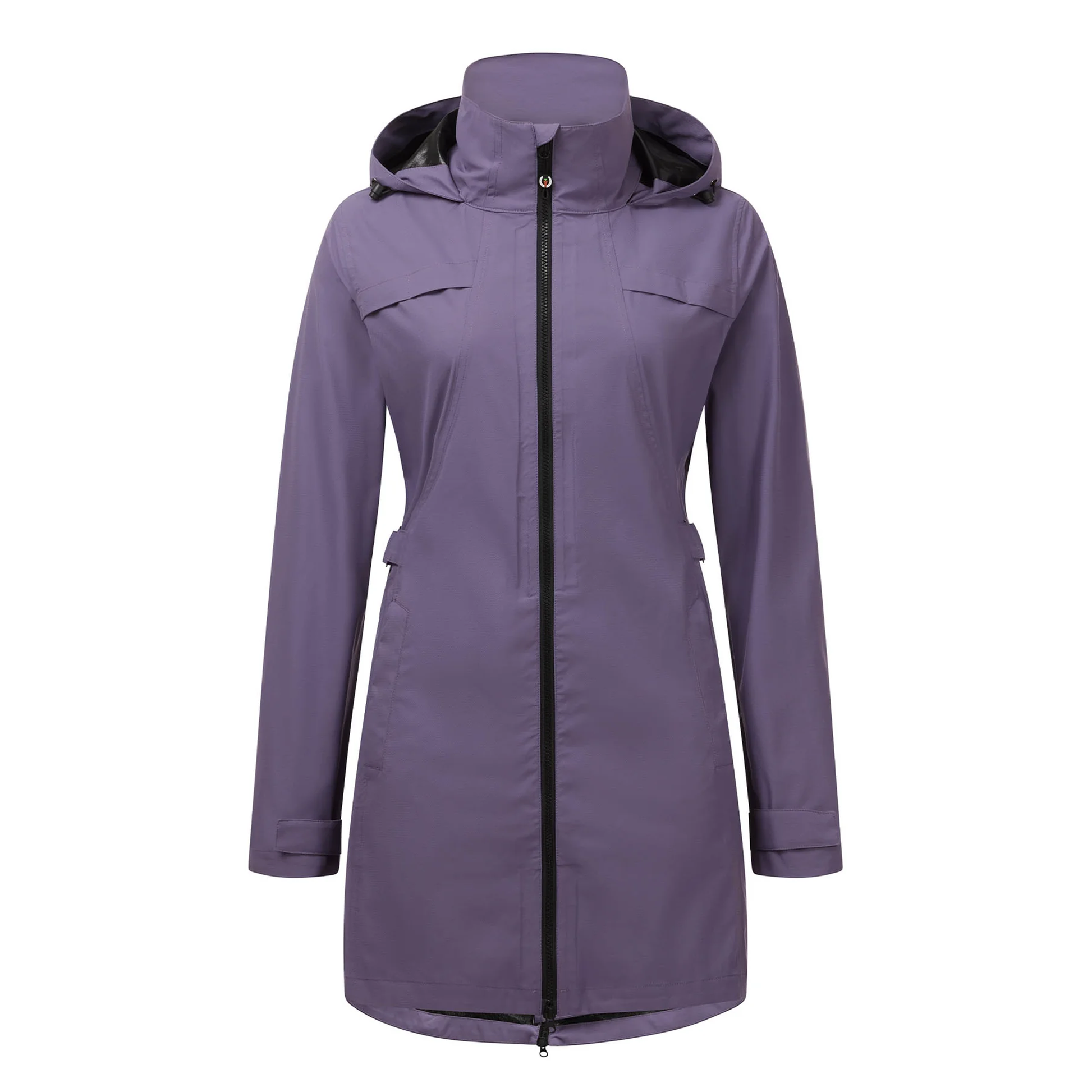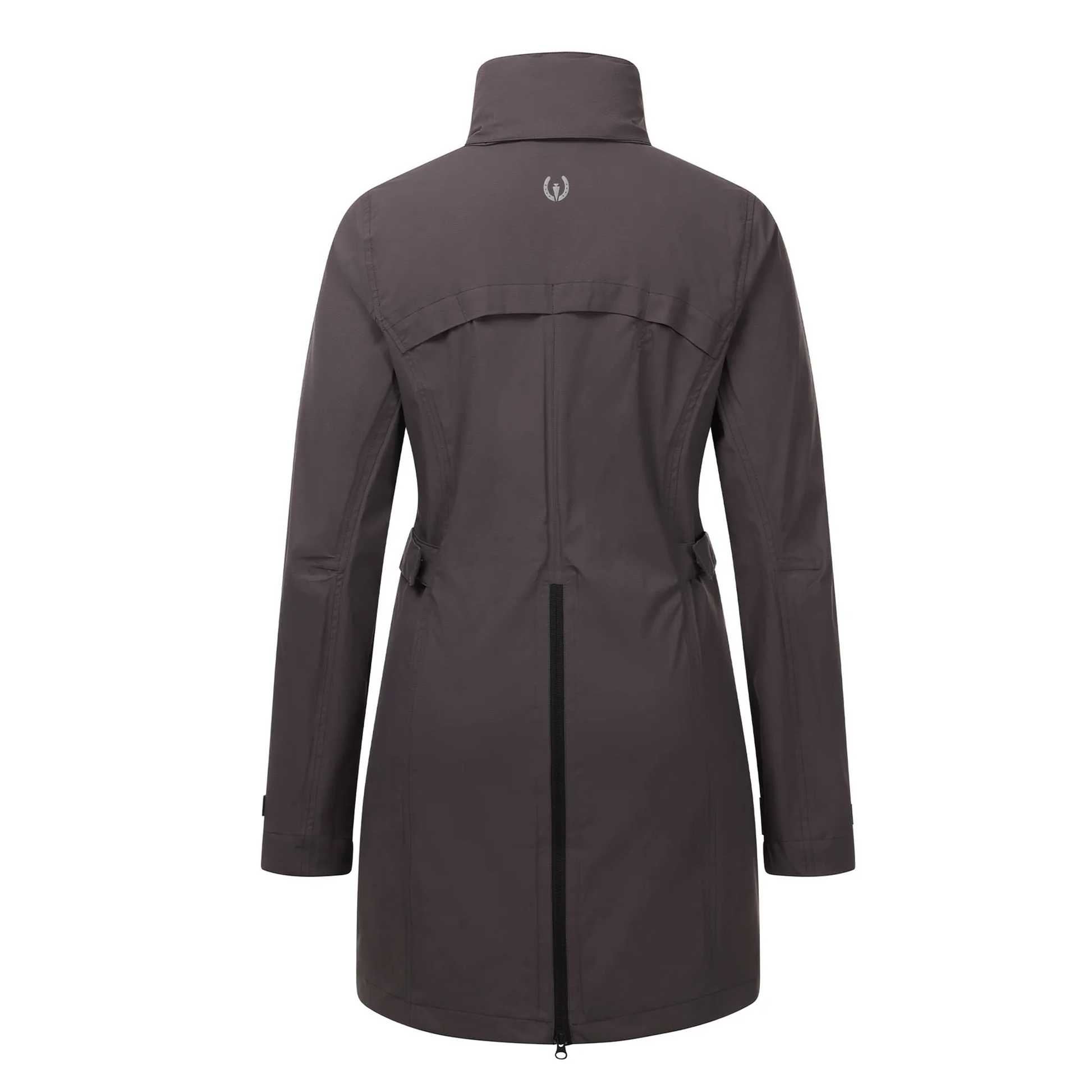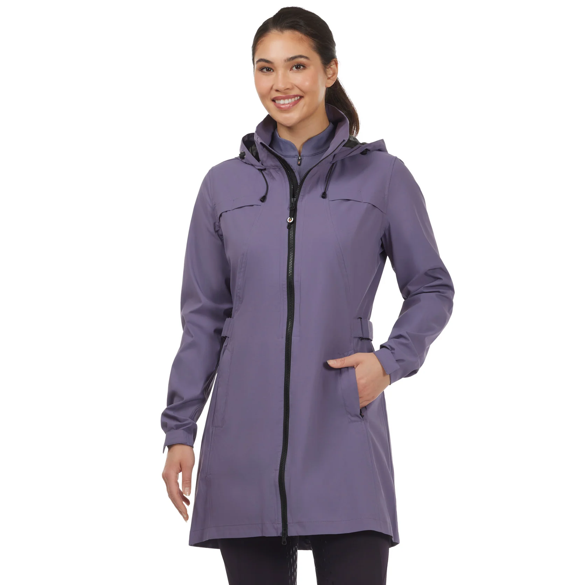 A lightweight, wind and waterproof jacket engineered for equestrians, this three-quarter length, seam-sealed coat stretches with you as you ride through summer rain. Front and back yokes are mesh lined for ventilation when needed. Two side tabs at the waist adjust for a flattering, custom fit. Stowable, extended brim hood keeps rain off your face, drawcord secures it in the wind. Double front zip and back zip gusset open to provide in-saddle coverage and performance. Two spacious zip pockets.
